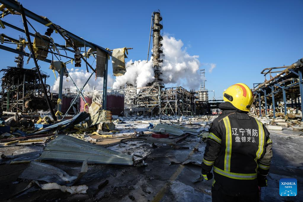 A firefighter works at the site of a chemical plant explosion in Panjin, northeast China's Liaoning Province, Jan. 16, 2023. (Xinhua/Pan Yulong)