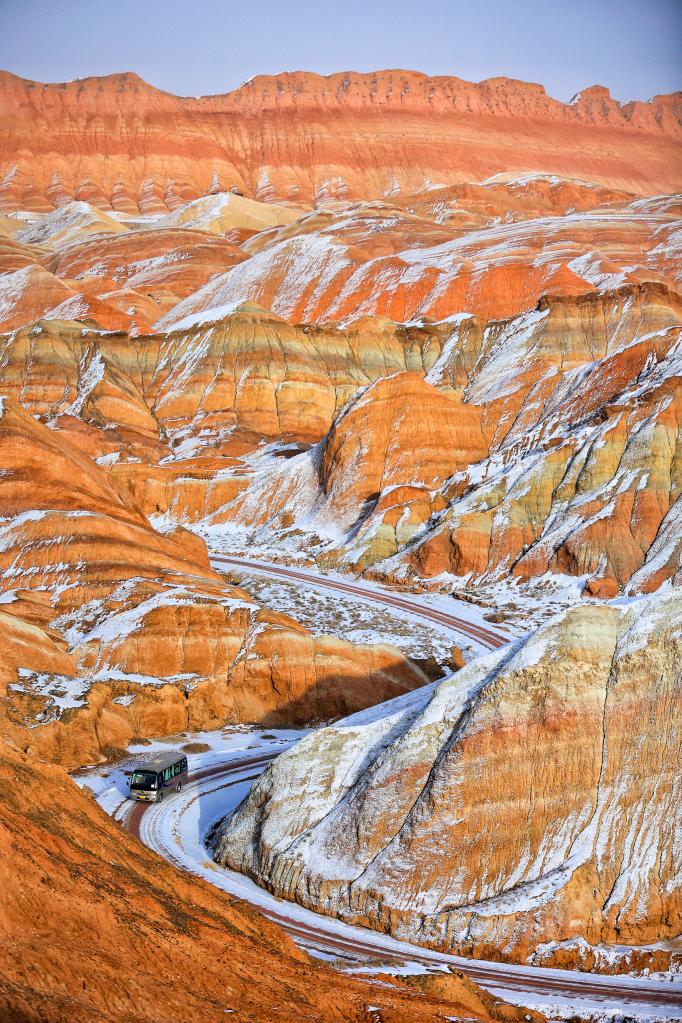 This photo taken on Jan. 15, 2023 shows the snow scenery of Danxia landform, characterized by reddish sandstone features, in Zhangye, northwest China's Gansu Province. (Photo by Wang Chao/Xinhua)