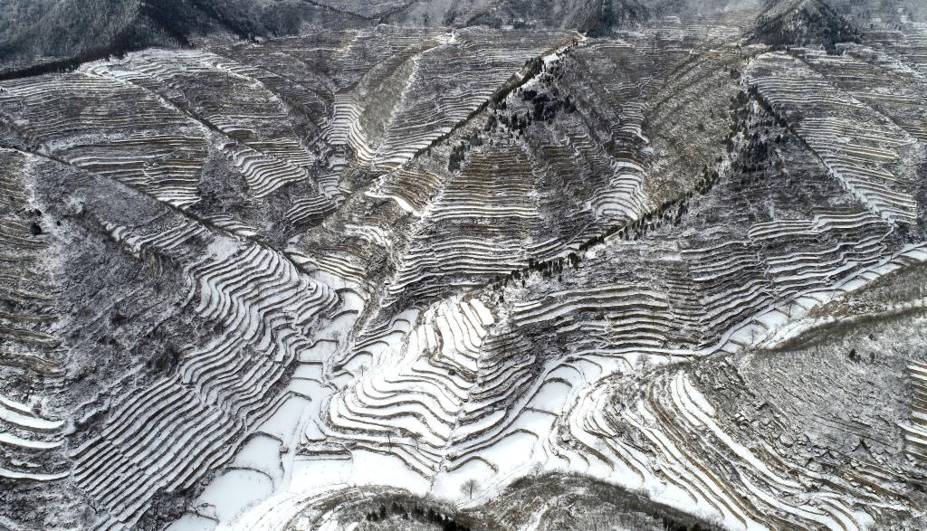 This aerial photo taken on Jan. 15, 2023 shows a view of snow-covered terraced fields in Shexian County of Handan, north China's Hebei Province. (Photo by Hao Qunying/Xinhua)