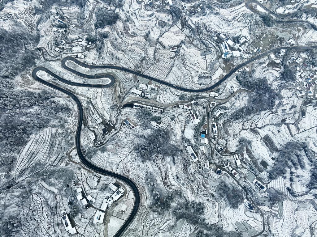 This aerial photo taken on Jan. 16, 2023 shows snow-covered villages and roads in Maoping Township of Zigui County in Yichang, central China's Hubei Province. (Photo by Wang Huifu/Xinhua)