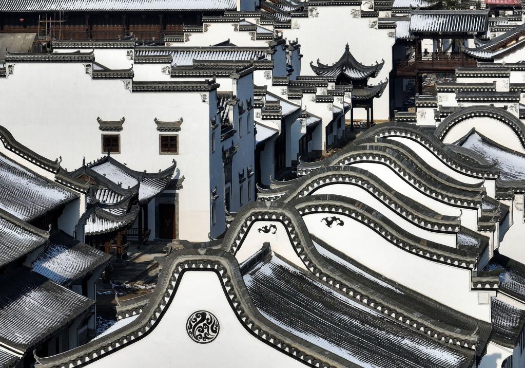 This aerial photo taken on Jan. 16, 2023 shows the snow scenery of ancient buildings in Yunmeng County of Xiaogan City, central China's Hubei Province. (Photo by Hu Xuejun/Xinhua)