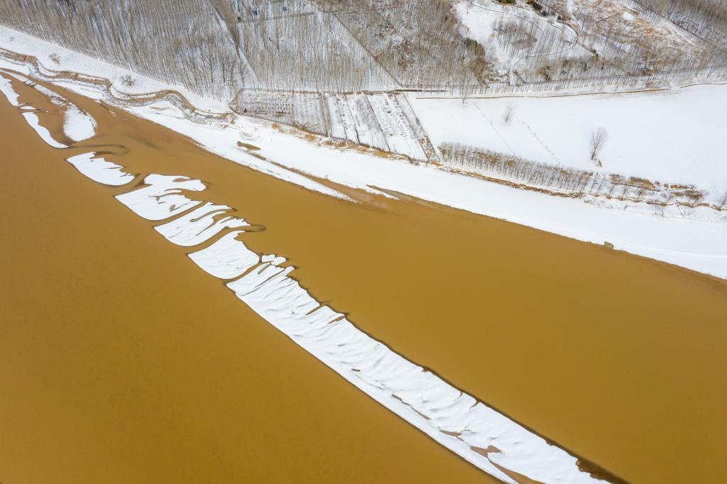 This aerial photo taken on Jan. 14, 2023 shows the snow scenery along the Yellow River in Gaoqing County, east China's Shandong Province. (Photo by Zhang Weitang/Xinhua)