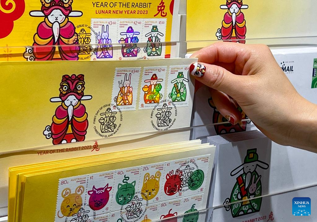 Stamps marking the Year of the Rabbit are seen at a post office in Melbourne, Australia, Jan. 17, 2023. (Photo by Hu Jingchen/Xinhua)