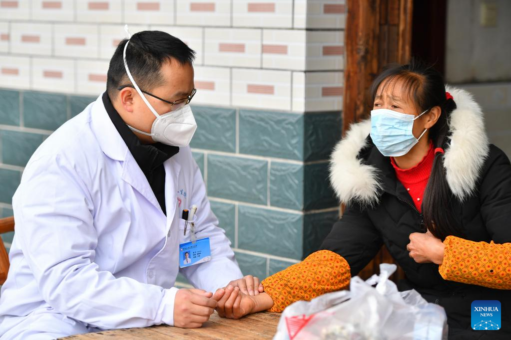 A medical worker checks a villager's pulse in Panlongling Village of Qiaokou Town, Wangcheng District, Changsha, central China's Hunan Province, Jan. 17, 2023. As the Spring Festival approaches, medical workers from rural health centers of Wangcheng District have provided free traditional Chinese medicine (TCM) care packages and door-to-door services to senior residents and others in need. Wangcheng District has so far delivered more than 21,000 TCM care packages in total to its rural residents. (Xinhua/Chen Zeguo)