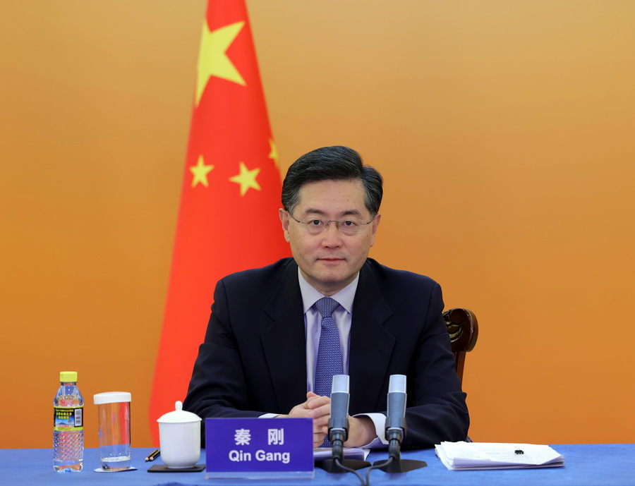 Foreign Minister Qin Gang participates in the opening of the 14th "Love Knows No Borders" international charity sale via video link in Beijing on Jan 17, 2023. [Photo by Feng Yongbin/chinadaily.com.cn]