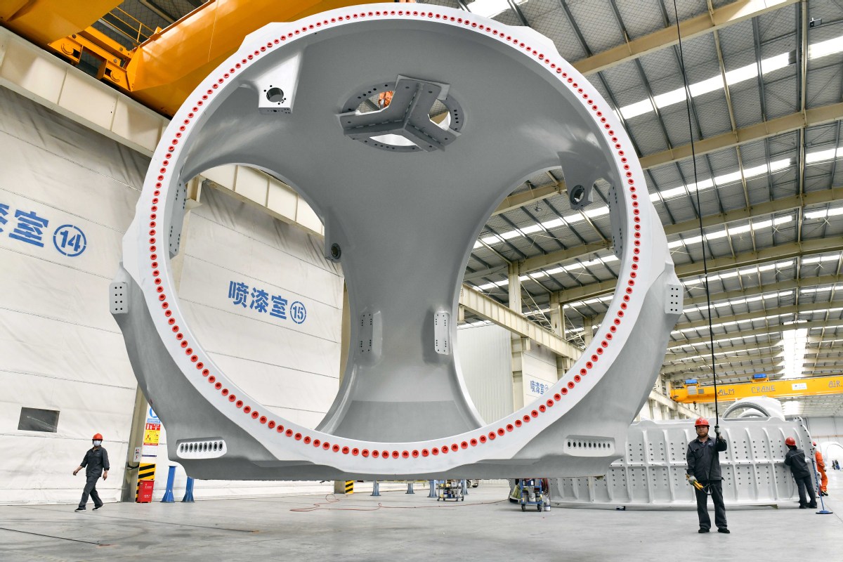 People work at a wind power equipment industrial base in Huimin county, Shandong province on June 7, 2022. [Photo/Xinhua]