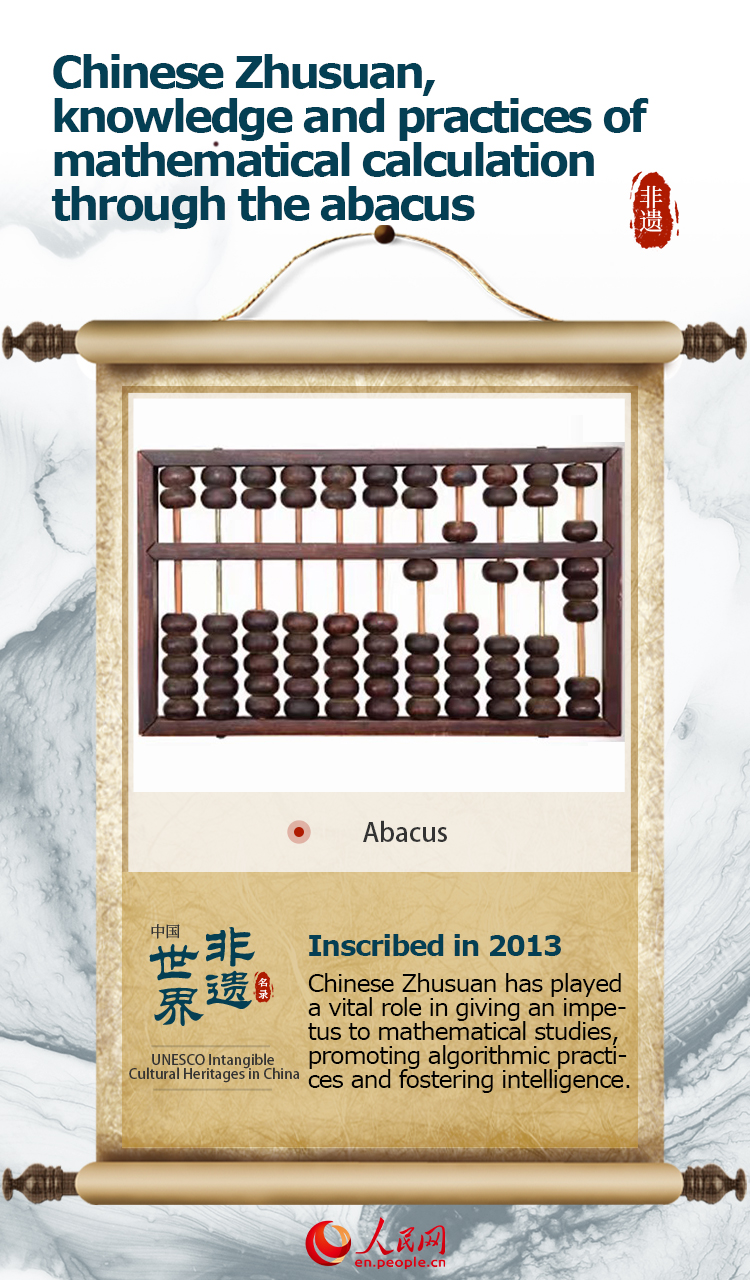 The item “Chinese Zhusuan, knowledge and practices of mathematical calculation through the abacus” was inscribed on UNESCO's Representative List of the Intangible Cultural Heritage of Humanity in 2013.
