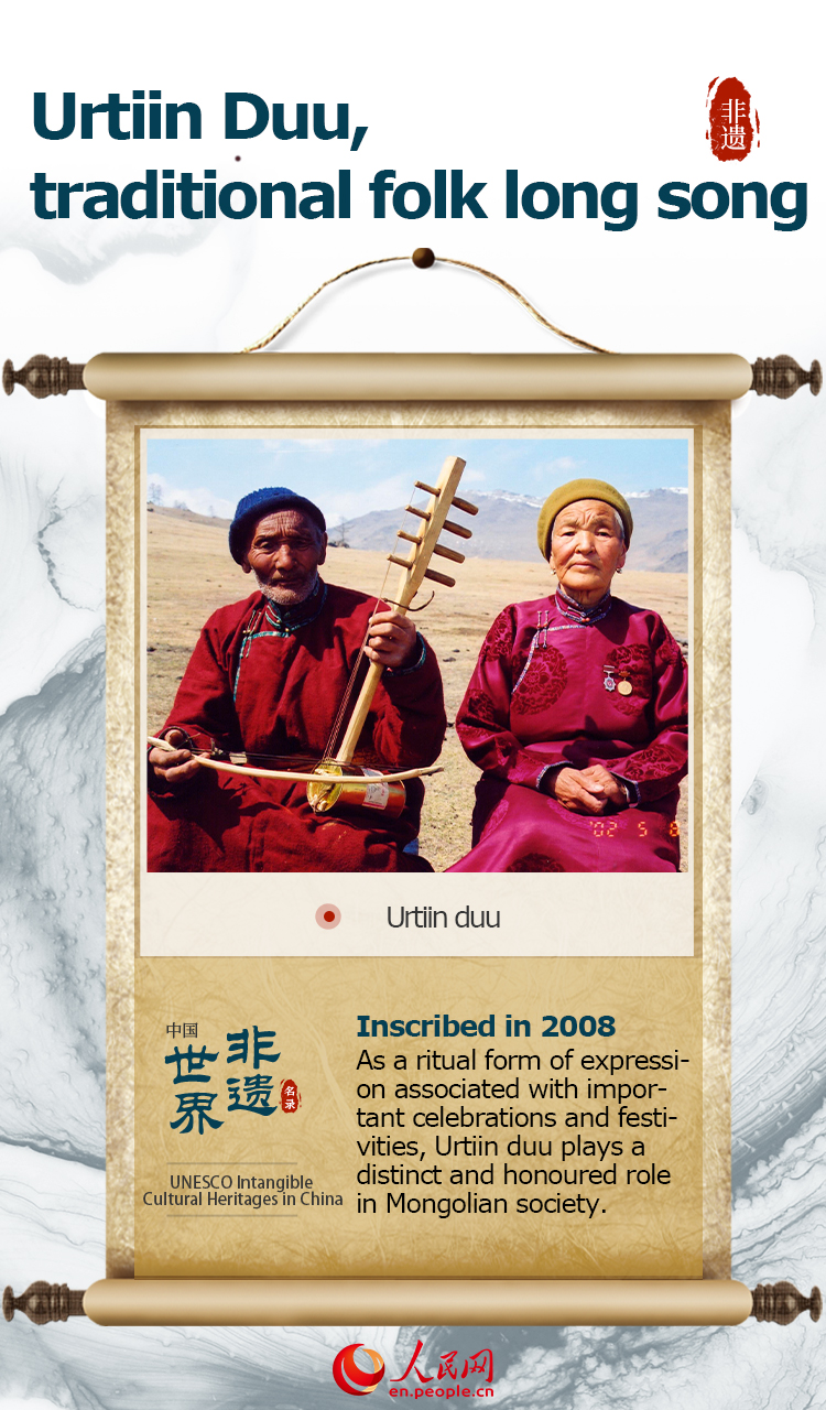 The item “Urtiin Duu, traditional folk long song” was inscribed on UNESCO's Representative List of the Intangible Cultural Heritage of Humanity in 2008.