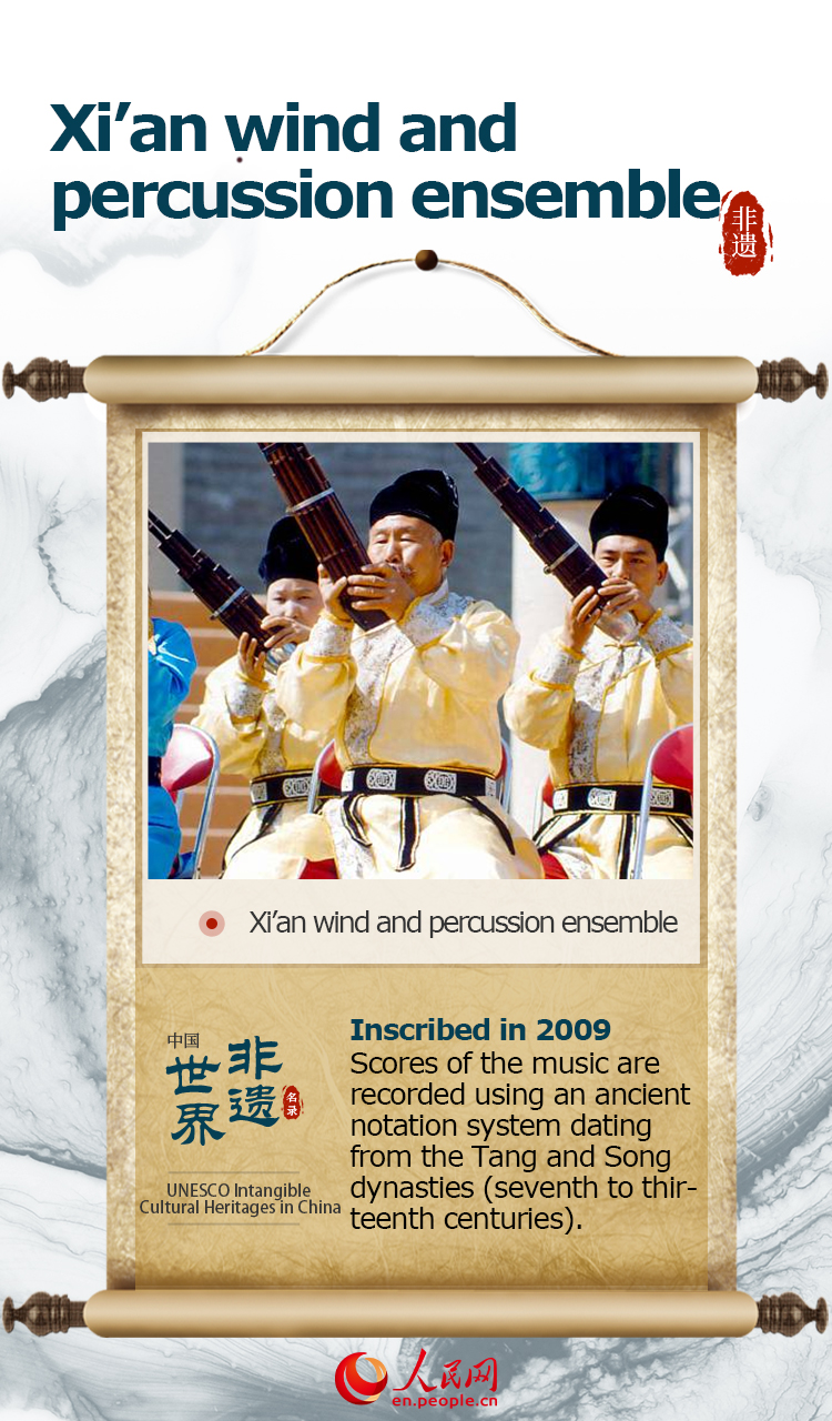 The item “Xi’an wind and percussion ensemble” was inscribed on UNESCO's Representative List of the Intangible Cultural Heritage of Humanity in 2009.