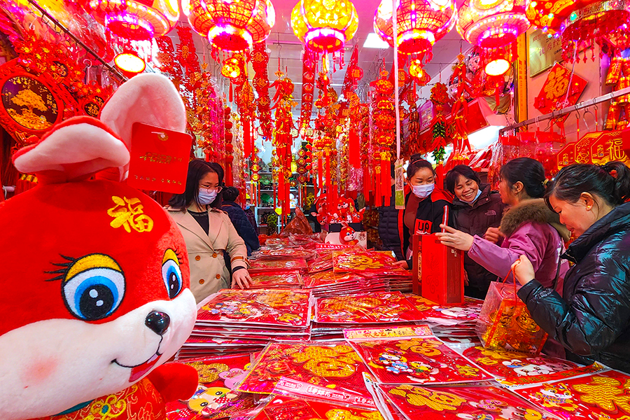 People buy Lunar New Year decorations at a market in Changning, Hunan province, on Jan 11, 2023. [Photo/ZHOU XIUYUCHUN/XINHUA]