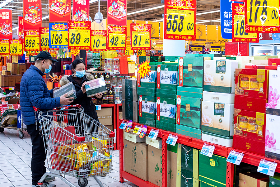 Consumers check out health-related gift boxes for the upcoming Spring Festival at a supermarket in Shanghai on Friday. [Photo/CHINA DAILY]