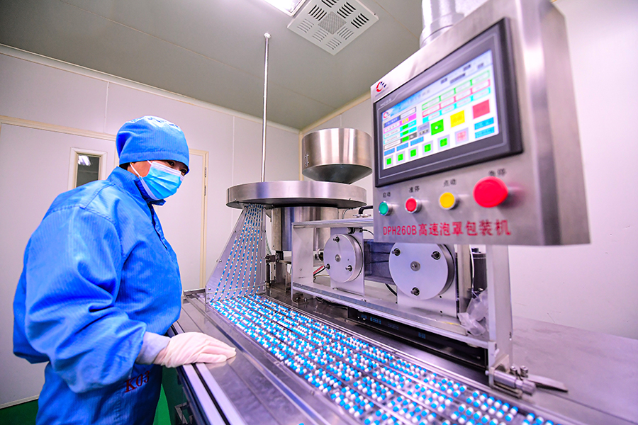An employee supervises packaging at a drug firm's production unit in Shenyang, Liaoning province, on Jan 12, 2023. [Photo by ZHANG WENKUI/FOR CHINA DAILY]