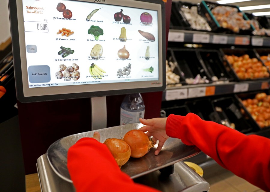 A purchaser weighs food in a supermarket in London, Britain, May 5, 2022. (Xinhua/Li Ying)