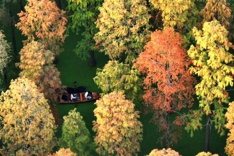 This aerial photo taken on Nov. 9, 2022 shows visitors taking a boat at a metasequoia forest in Luyang Lake wetland park in Yangzhou, east China's Jiangsu Province. (Photo by Meng Delong/Xinhua)