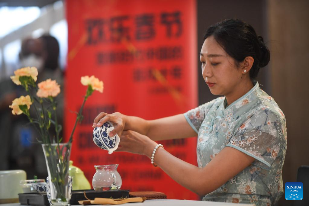 A Chinese language teacher of the Confucius Institute at Addis Ababa University (AAU) performs a tea ceremony during a special ceremony of the exhibition themed Happy Chinese New Year and an Extraordinary Decade of China in the New Era, in Addis Ababa, Ethiopia, on Jan. 17, 2023. (Xinhua/Michael Tewelde)
