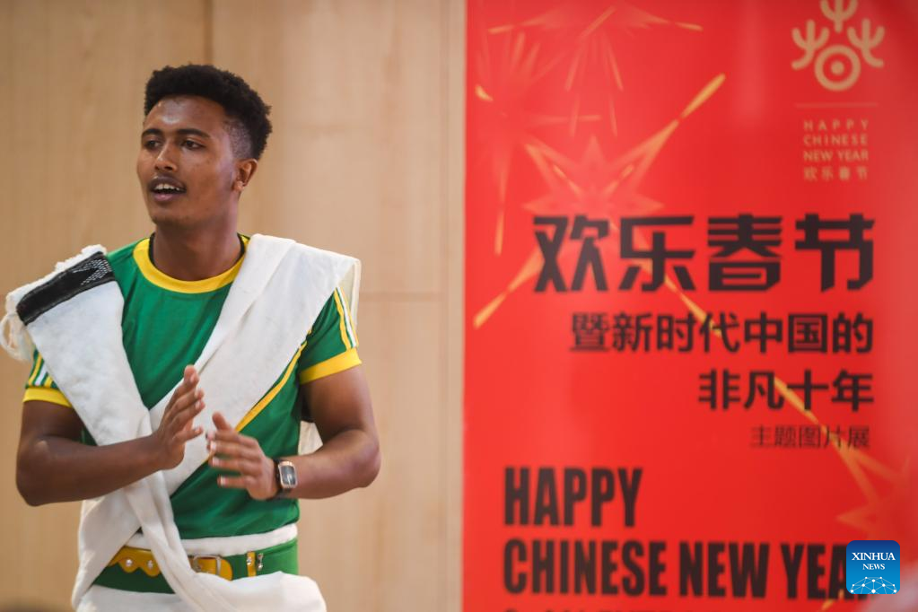 A Chinese language student from the Confucius Institute at Addis Ababa University (AAU) performs a traditional Ethiopian dance during a special ceremony of the exhibition themed Happy Chinese New Year and an Extraordinary Decade of China in the New Era, in Addis Ababa, Ethiopia, on Jan. 17, 2023. (Xinhua/Michael Tewelde)