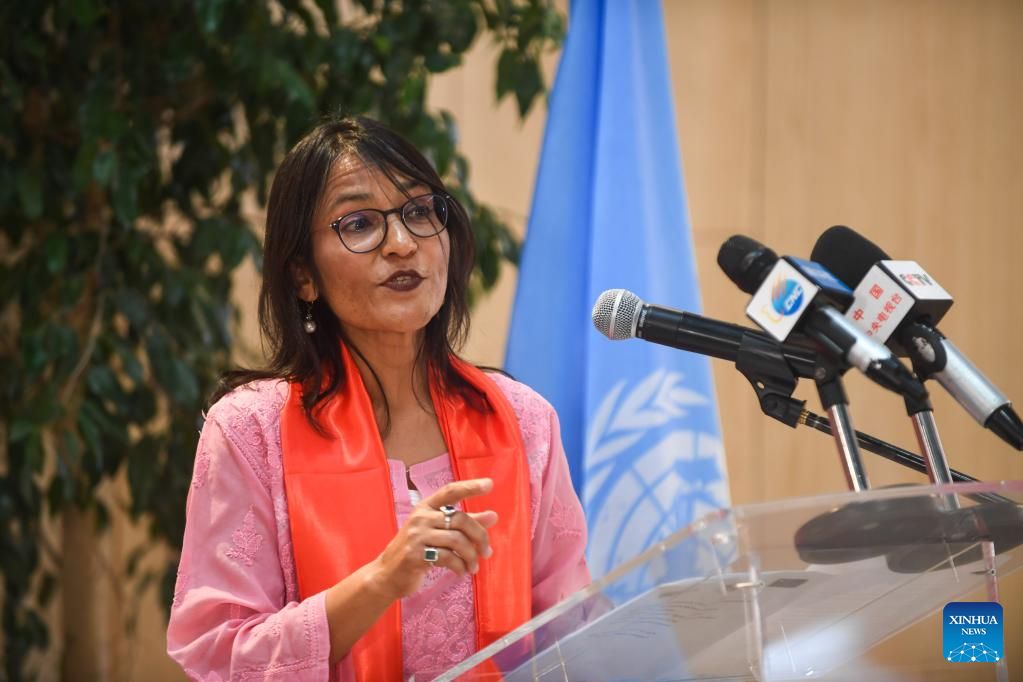 Chief of Staff at the United Nations Economic Commission for Africa (UNECA) Sweta Saxena speaks during an opening event of the exhibition themed Happy Chinese New Year and an Extraordinary Decade of China in the New Era, in Addis Ababa, Ethiopia, on Jan. 17, 2023. (Xinhua/Michael Tewelde)