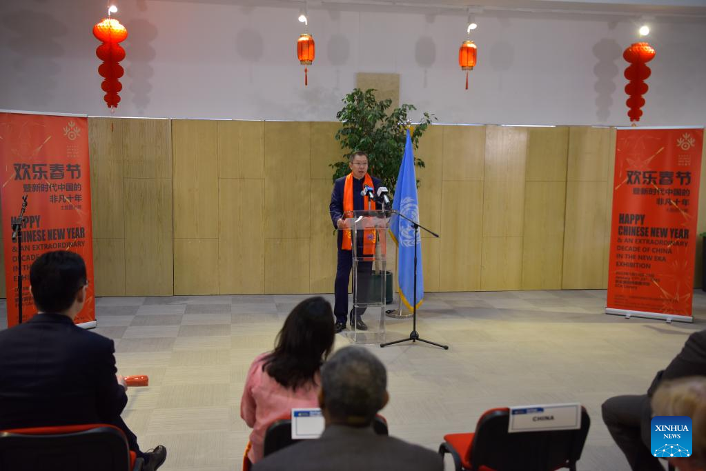 Hu Changchun (Rear), head of the Chinese Mission to the African Union (AU), speaks during an opening event of the exhibition themed Happy Chinese New Year and an Extraordinary Decade of China in the New Era, in Addis Ababa, Ethiopia, on Jan. 17, 2023. (Xinhua/Michael Tewelde)