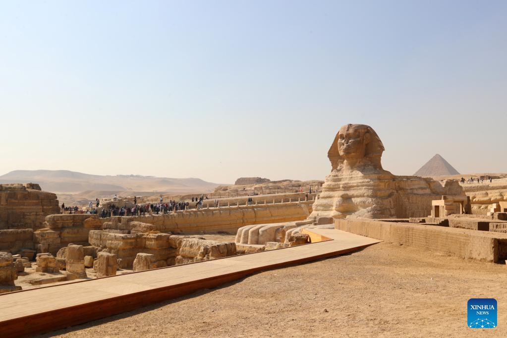 Tourists visit the Sphinx at the Giza Pyramids scenic spot in Giza, Egypt, Jan. 18, 2023. Egypt warmly welcomes the Chinese people to visit as soon as possible, Egyptian President Abdel-Fattah al-Sisi has said in the country's capital Cairo. (Xinhua/Sui Xiankai)