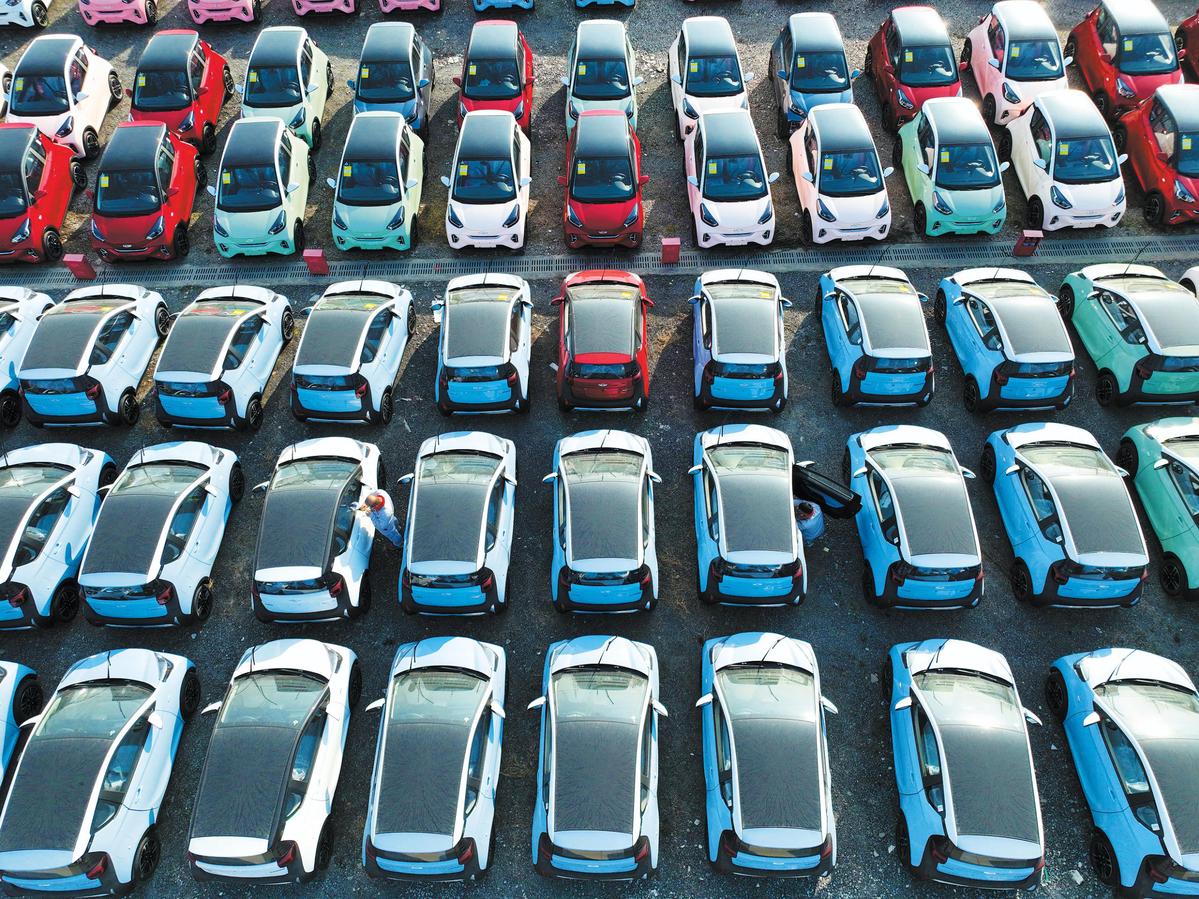 New energy vehicles are lined up at a carmaker's yard in Wuhu, Anhui province. [Photo by Wang Yushi/For China Daily]