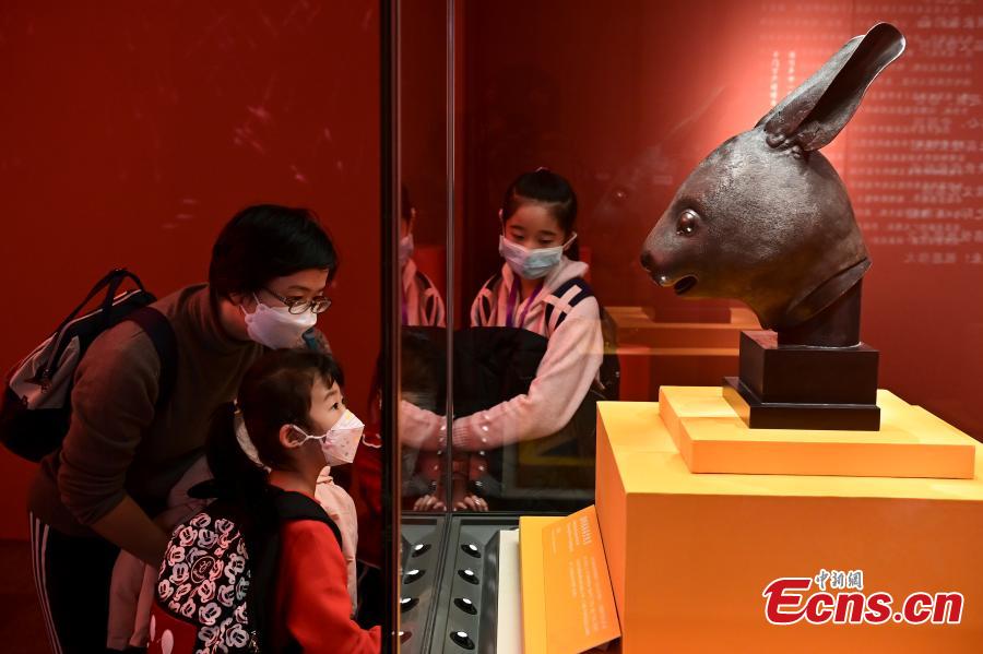 Visitors view a bronze head of a rabbit, one of the 12 animal head sculptures that formed a zodiac water clock previously standing at Yuanmingyuan, or the Old Summer Palace, is on display at the National Museum of China in Beijing, Jan. 18, 2023. (Photo: China News Service/Tian Yuhao)