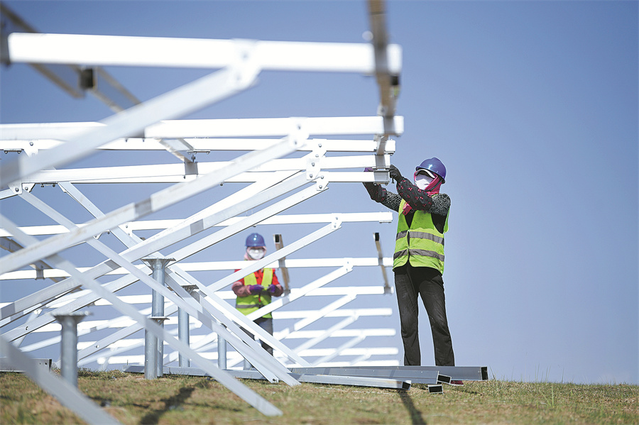 Workers assemble solar panels to expand the use of clean energy along the river in Qinghai province. ZHANG LONG/XINHUA