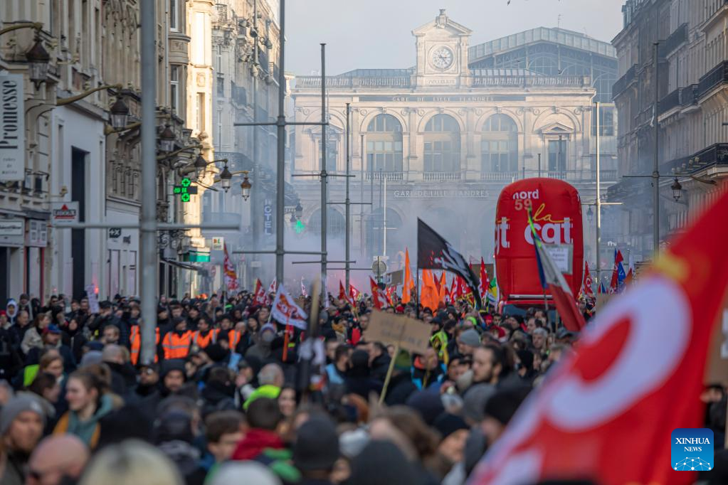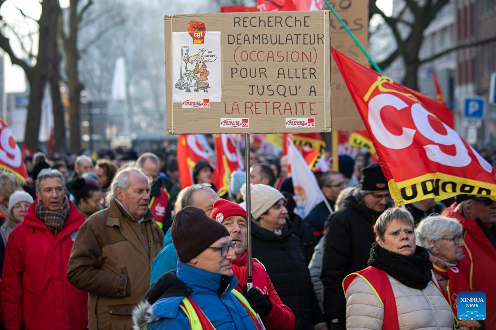 Demonstrators take part in a rally against the government's pension reform plan in Lille, France, on Jan. 19, 2023. France's Ministry of the Interior said that an estimated 1.12 million French people took to the streets across the country on Thursday to protest against the government's controversial pension reform plan. (Photo by Sebastien Courdji/Xinhua)