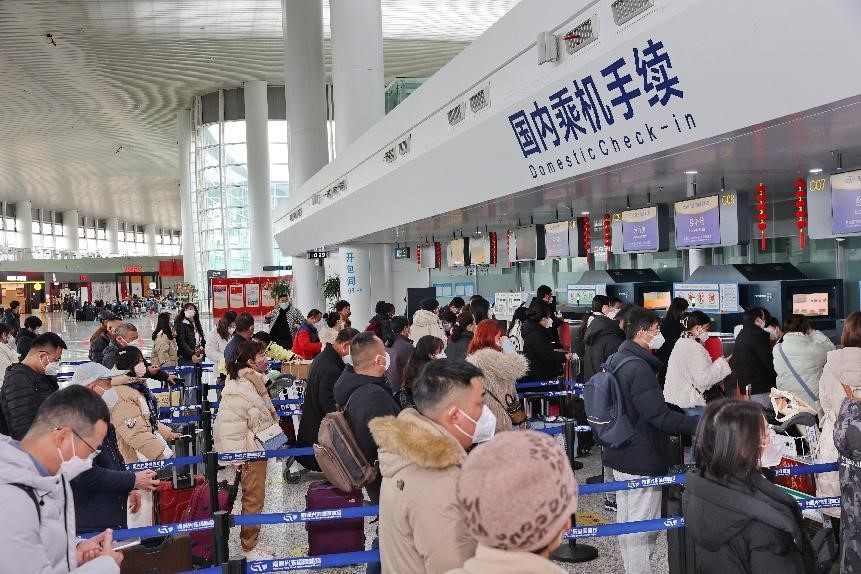 Passengers wait in lines to check in at Nantong Xingdong International Airport, east China's Jiangsu province, Jan. 12, 2023. (People's Daily Online/Xu Congjun)