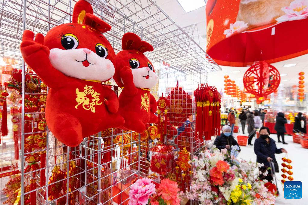 Customers shop at a Chinese supermarket with decorations marking the upcoming Chinese Lunar New Year of the Rabbit at a shopping center in Toronto, Canada, on Jan. 18, 2023. The Chinese Lunar Year of the Rabbit begins on Jan. 22, 2023. (Photo by Zou Zheng/Xinhua)