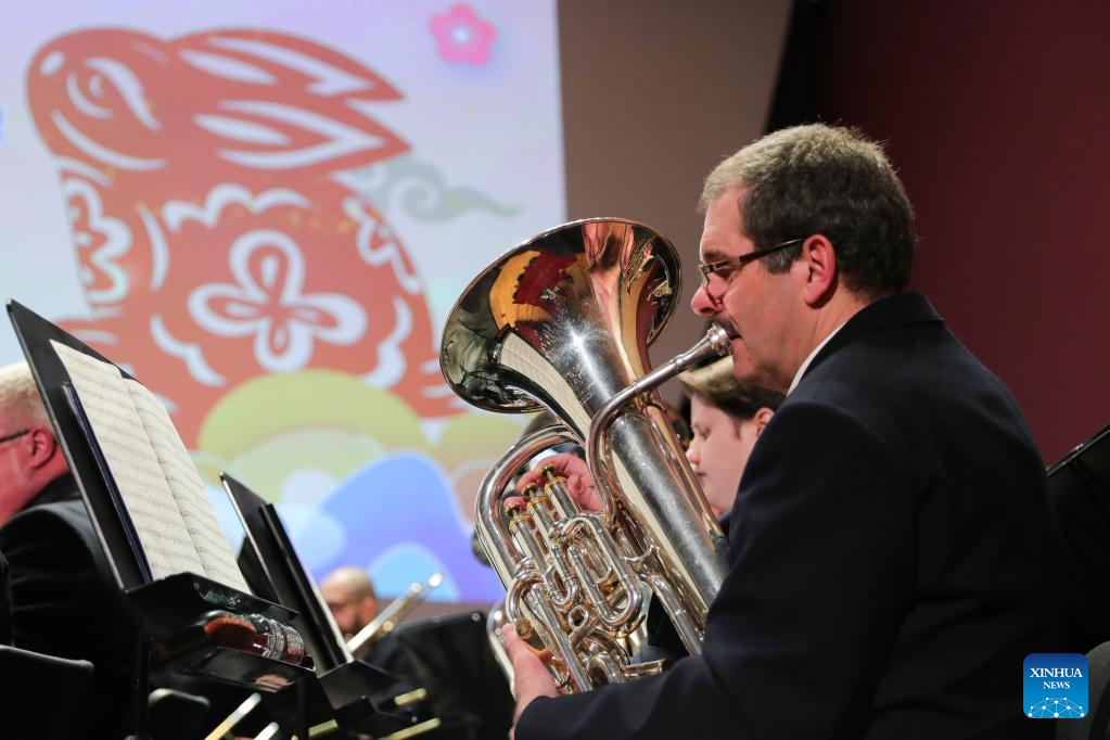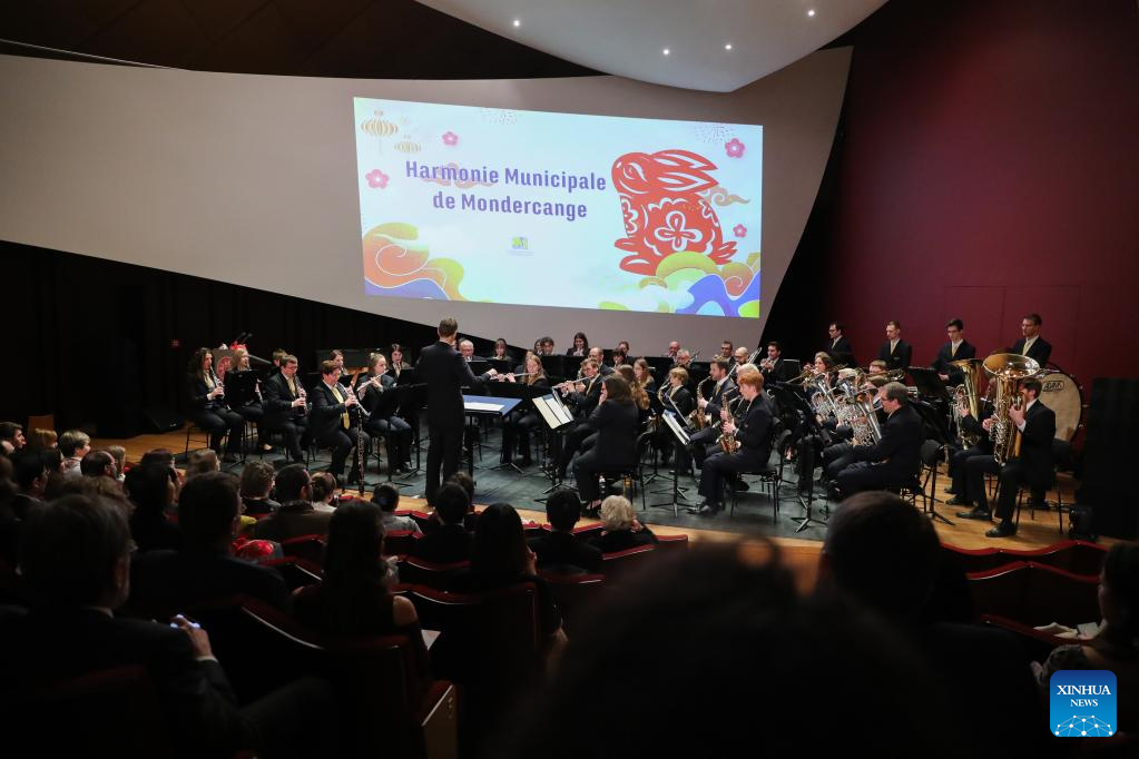 Members of Harmonie Municipale de Mondercange perform during the "Beauty Beyond Words" 2023 Chinese New Year Dance and Music Show at the Philharmonie Luxembourg concert hall in Luxembourg, Jan. 17, 2023. (Xinhua/Zheng Huansong)
