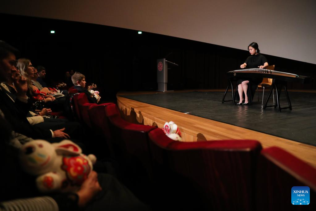 Tang Jiaxuan performs solo with Chinese folk instrument Guzheng during the "Beauty Beyond Words" 2023 Chinese New Year Dance and Music Show at the Philharmonie Luxembourg concert hall in Luxembourg, Jan. 17, 2023. (Xinhua/Zheng Huansong)