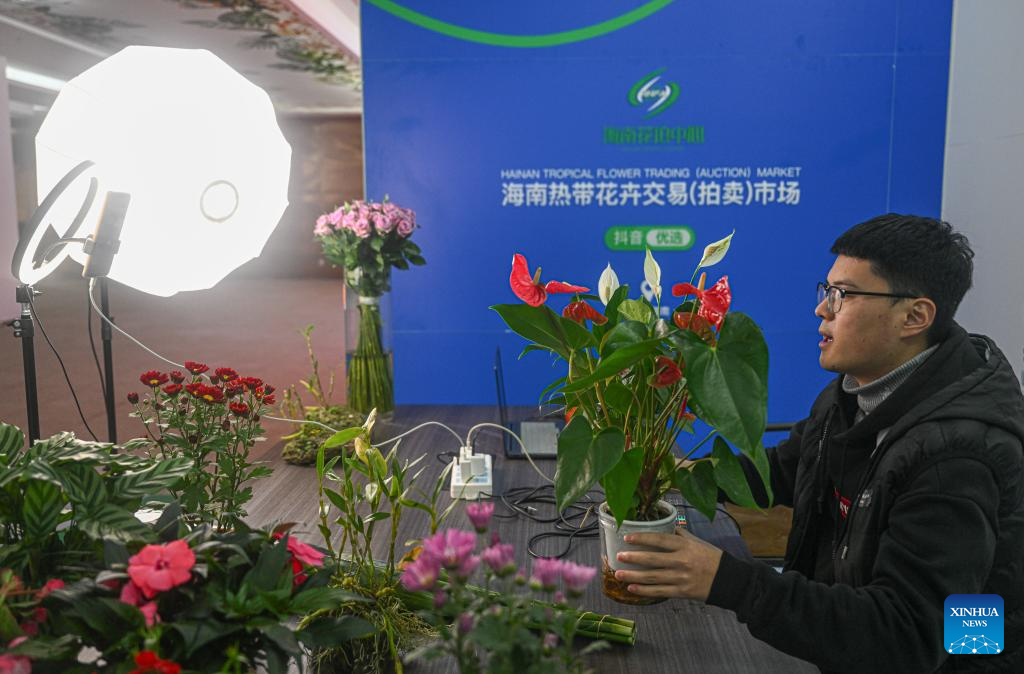 A man introduces tropical flowers through livestreaming at the Hainan Tropical Flower Trading (Auction) Market in Haikou, south China's Hainan Province, Jan. 18, 2023. (Xinhua/Pu Xiaoxu)