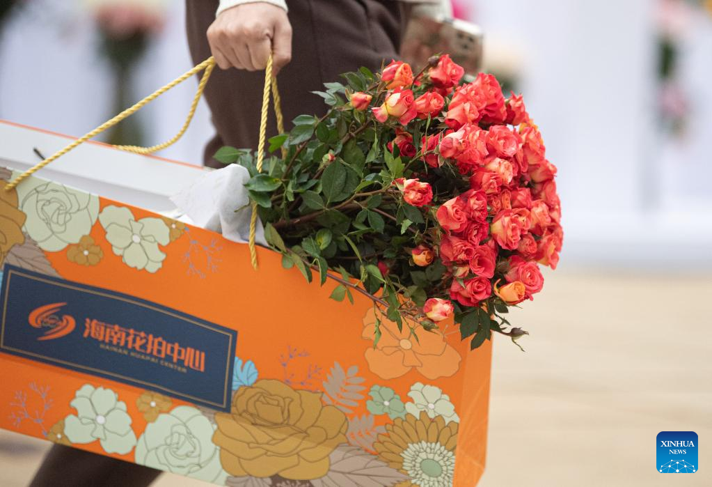 This photo taken on Jan. 18, 2023 shows a customer carrying a bunch of flowers shopped at the Hainan Tropical Flower Trading (Auction) Market in Haikou, south China's Hainan Province. (Xinhua/Pu Xiaoxu)