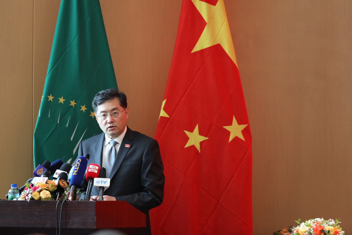 Foreign minister Qin Gang and Moussa Faki Mahamat (not pictured), the chairperson of the AU Commission, jointly meet the media in Addis Ababa, Ethiopia on Jan 11, 2023. [Photo/Xinhua]