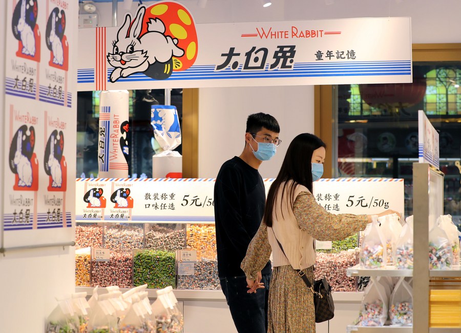 People shop at a White Rabbit candy franchise shop at Yuyuan Garden in Shanghai, east China, Oct. 8, 2020. (Xinhua/Liu Ying)