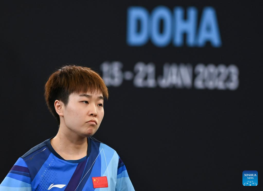 (230121) -- DOHA, Jan. 21, 2023 (Xinhua) -- Zhang Rui reacts during the women's singles final match between Fang Siqi of China and her teammate Zhang Rui at WTT Contender Doha 2023 table tennis tournament in Doha, Qatar, on Jan. 21, 2023. (Photo by Nikku/Xinhua)