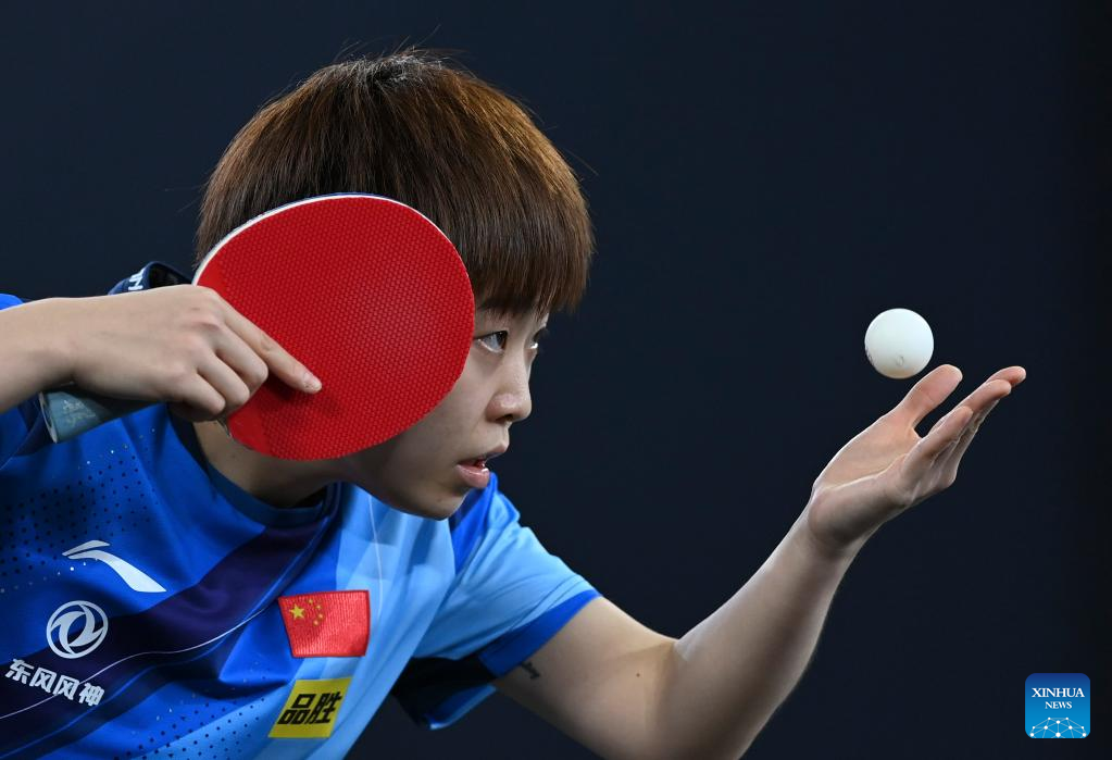 (230121) -- DOHA, Jan. 21, 2023 (Xinhua) -- Fan Siqi hits a return during the women's singles final match between Fang Siqi of China and her teammate Zhang Rui at WTT Contender Doha 2023 table tennis tournament in Doha, Qatar, on Jan. 21, 2023. (Photo by Nikku/Xinhua)