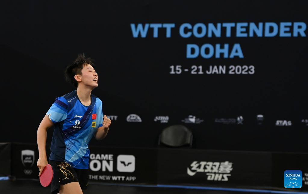 (230121) -- DOHA, Jan. 21, 2023 (Xinhua) -- Fan Siqi celebrates scoring during the women's singles final match between Fang Siqi of China and her teammate Zhang Rui at WTT Contender Doha 2023 table tennis tournament in Doha, Qatar, on Jan. 21, 2023. (Photo by Nikku/Xinhua)