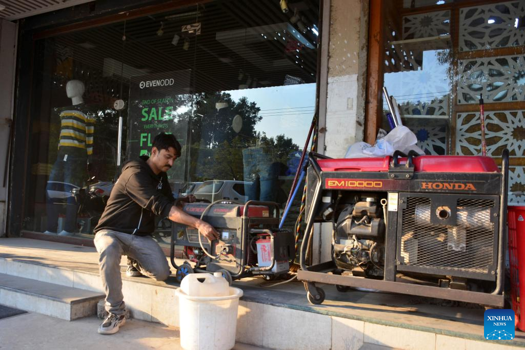 A shopkeeper starts a generator during a countrywide power outage in Hyderabad, Pakistan, Jan. 23, 2023. Millions of Pakistanis encountered power outage on Monday morning after the power distribution system of the South Asian country broke down, said the ministry of energy. (Str/Xinhua)