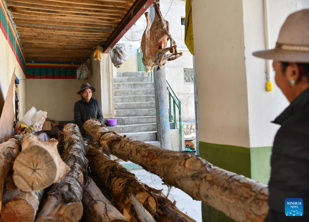Sonam Chungla (L) and his assistant pick a piece of wood for making Zhanian instrument in Lnaze County, southwest China's Tibet Autonomous Region, Jan. 19, 2023.