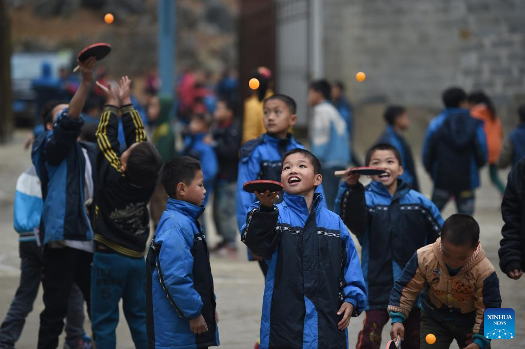 Meng Xuantai (C) plays table tennis at Nongyong primary school in Bansheng Town of Dahua Yao Autonomous County, south China's Guangxi Zhuang Autonomous Region, Jan. 6, 2015.