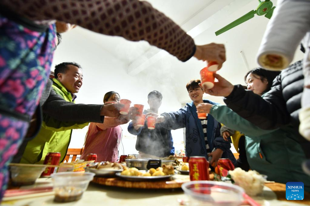 Meng Xuanren, Meng Xuantai and their relatives enjoy a feast in Nongding Village of Bansheng Town, Dahua Yao Autonomous County, south China's Guangxi Zhuang Autonomous Region, Jan. 20, 2023.