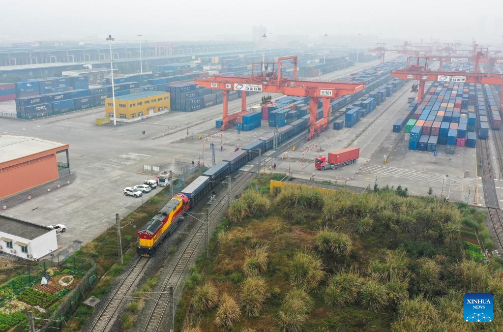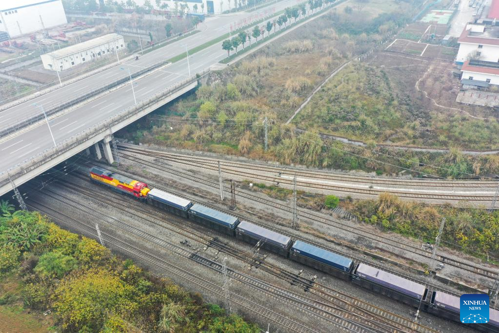 This aerial photo shows a rail-sea intermodal freight train carrying containers of goods, including cars, motorcycles, engines, and sodium carbonate, at Tuanjie Village Central Station in southwest China's Chongqing, Jan. 22, 2023. It was the city's first outbound cargo train of the New International Land-Sea Trade Corridor in the Year of the Rabbit. Goods on the train will be transported to Qinzhou port on the country's southern coast, from where they will be shipped to Indonesia, the Philippines, Australia, and some other countries and regions. (Xinhua/Liu Chan)