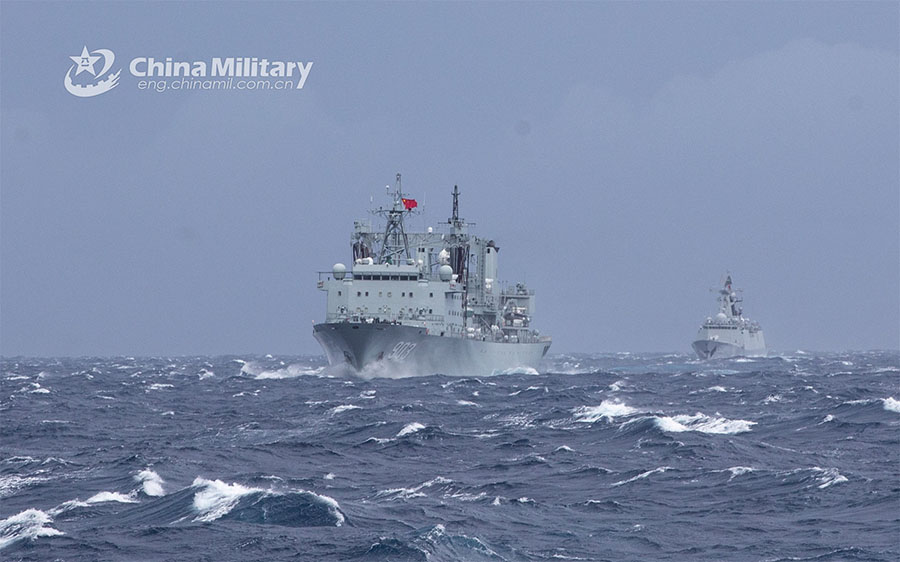 Vessels attached to the 42nd Chinese naval escort taskforce steam in formation in the waters of the Gulf of Aden during a maneuvering exercise in early January 2023. The exercise aimed to hone the taskforce’s capabilities of commanding and maneuvering vessels. (eng.chinamil.com.cn/Photo by Wang Qing)