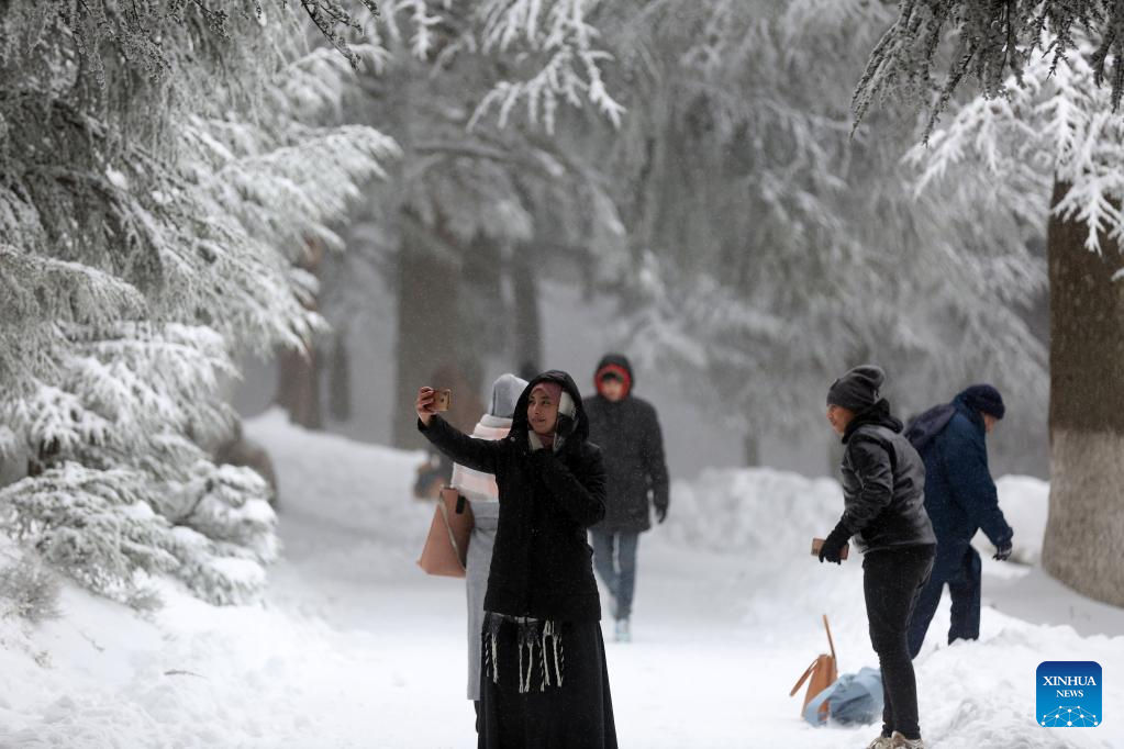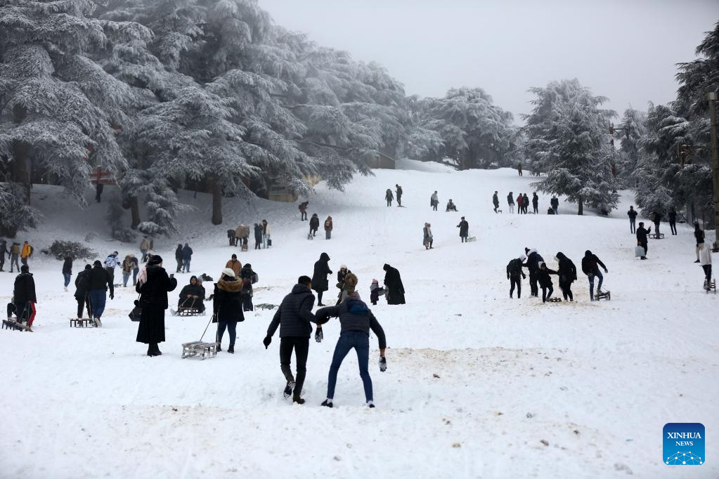 People enjoy the snow at Chrea National Park in Blida province, Algeria, Jan. 23, 2023. (Xinhua)