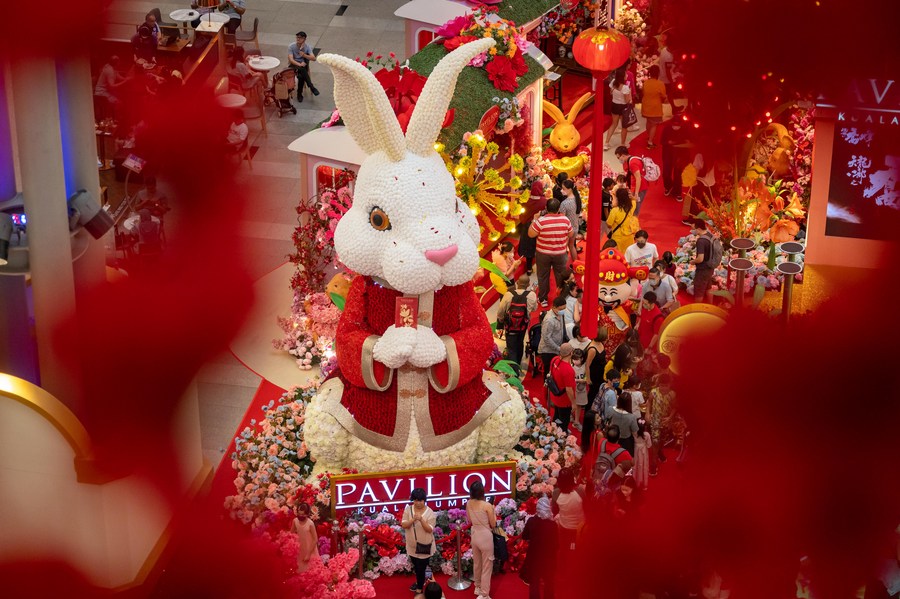 Rabbit shaped decorations are seen at a mall to greet the coming Chinese Lunar New Year in Kuala Lumpur, Malaysia, Jan. 7, 2023. (Photo by Chong Voon Chung/Xinhua)