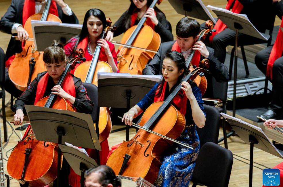 This photo taken on Jan. 14, 2023 shows the Chinese Lunar New Year concert presented by Xinjiang Art Theater's folk orchestra in Urumqi, northwest China's Xinjiang Uygur Autonomous Region. (Xinhua)
