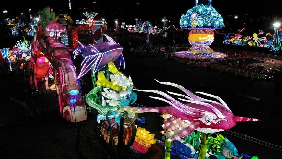 This aerial photo taken on Jan. 24, 2023 shows an ocean-themed lantern show in Qingdao, east China's Shandong Province. (Xinhua/Li Ziheng)