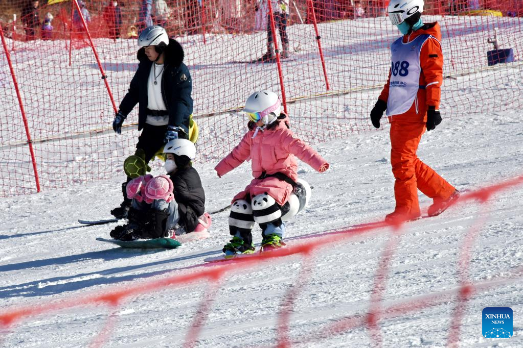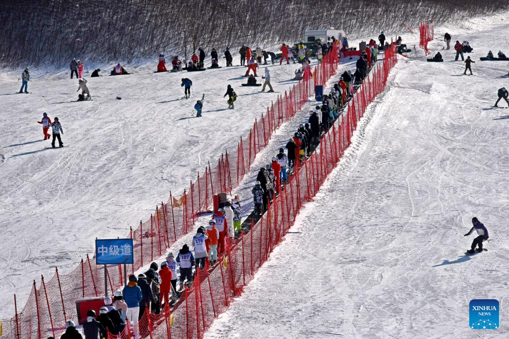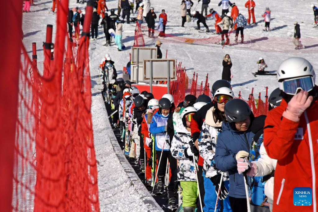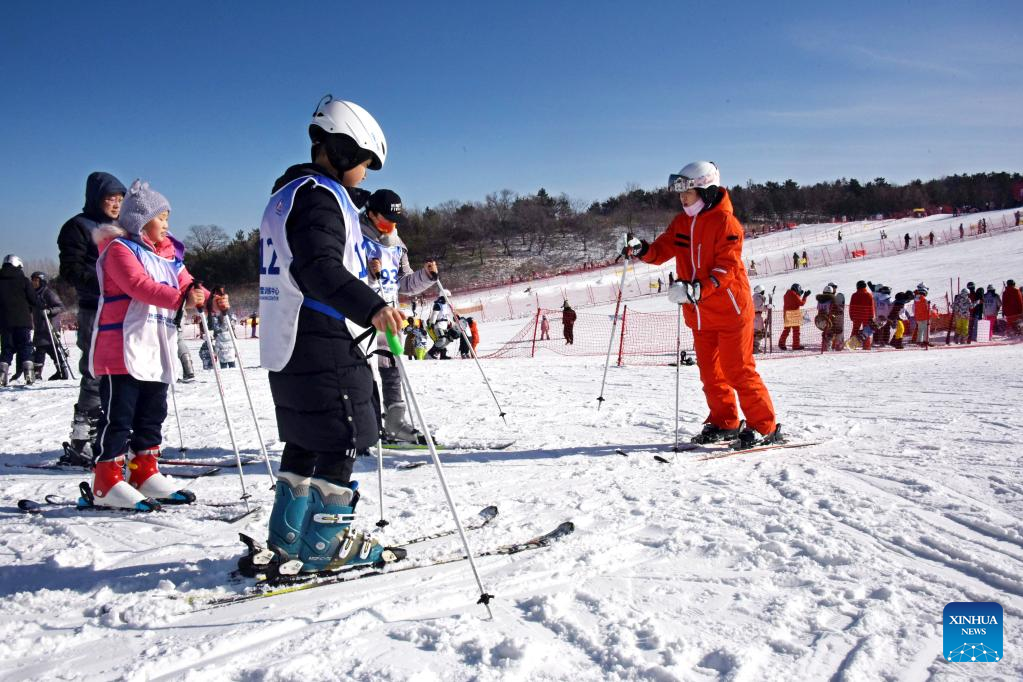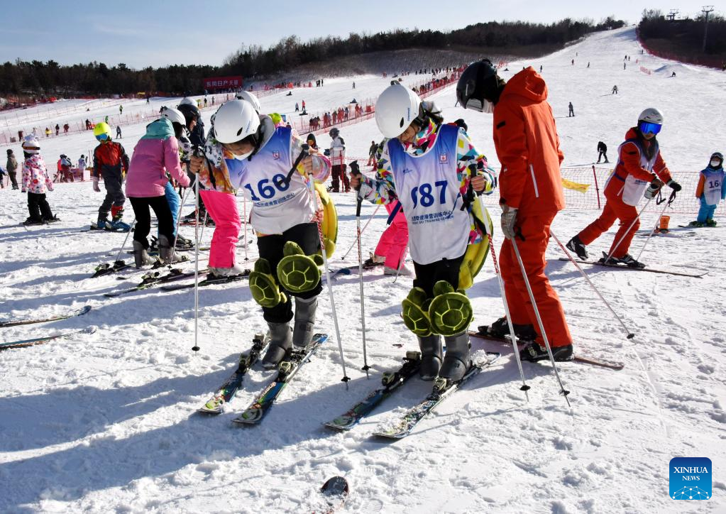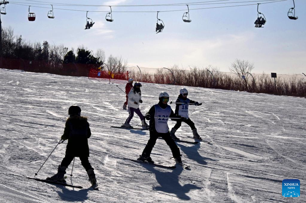 People experience skiing at a ski resort in Qingdao, east China's Shandong Province, Jan. 25, 2023. During the Spring Festival holiday, ski resorts in Qingdao have made full preparations to improve consumption experience and meet the demand of an increasing number of tourists. (Xinhua/Li Ziheng)