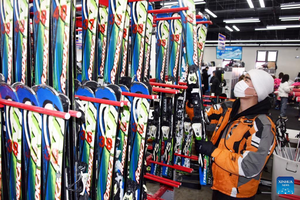 A tourist picks ski equipment at a ski resort in Qingdao, east China's Shandong Province, Jan. 25, 2023. During the Spring Festival holiday, ski resorts in Qingdao have made full preparations to improve consumption experience and meet the demand of an increasing number of tourists. (Xinhua/Li Ziheng)